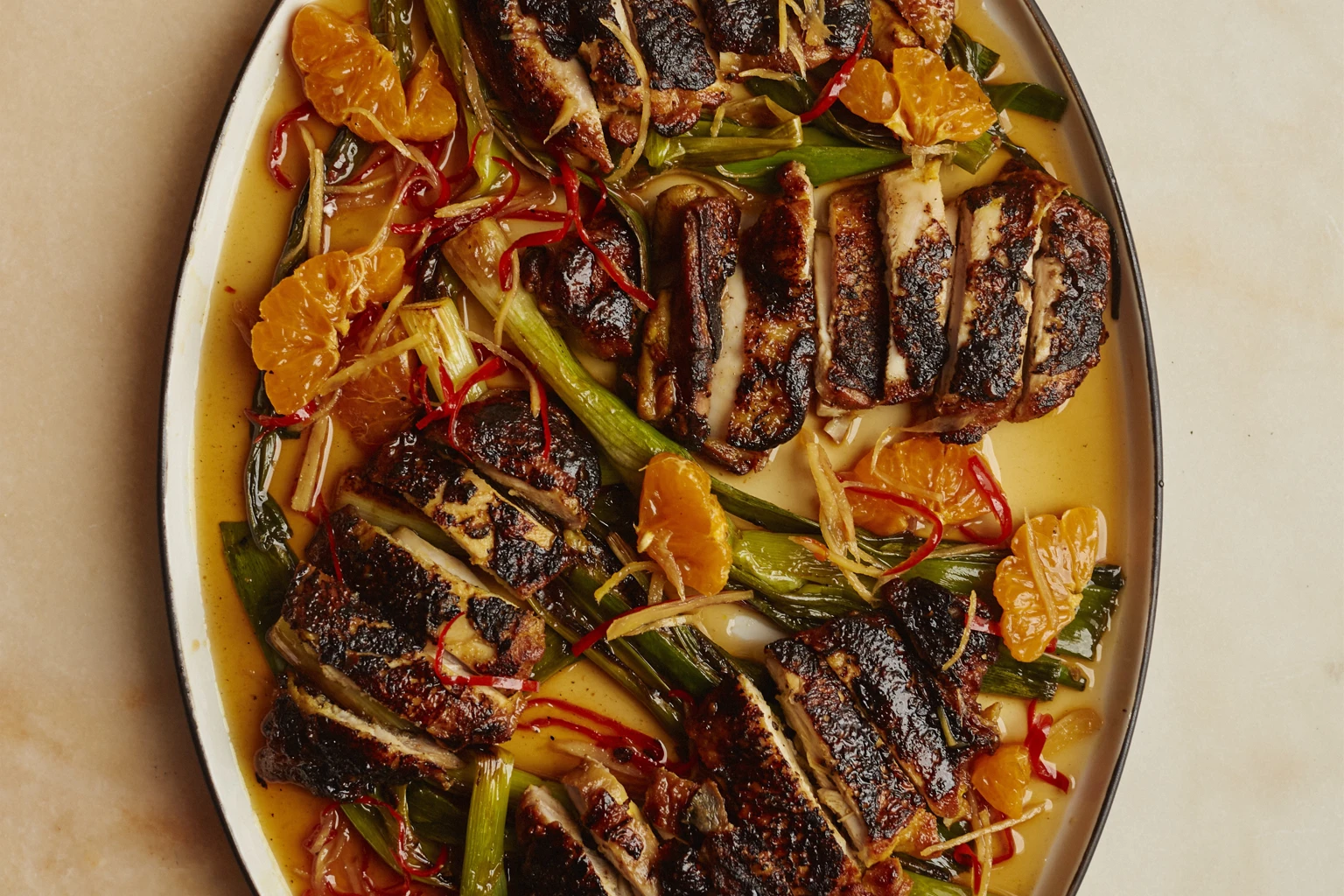 Noor Murad and Yotam Ottolenghi share their recipe for smoky, blackened chicken and a delicious caramel and clementine dressing. The sweet and sour dressing pairs well with roast chicken, pan-seared salmon, tofu or halloumi as well as blackened chicken and keeps in a sealed container in the fridge for 3 days.